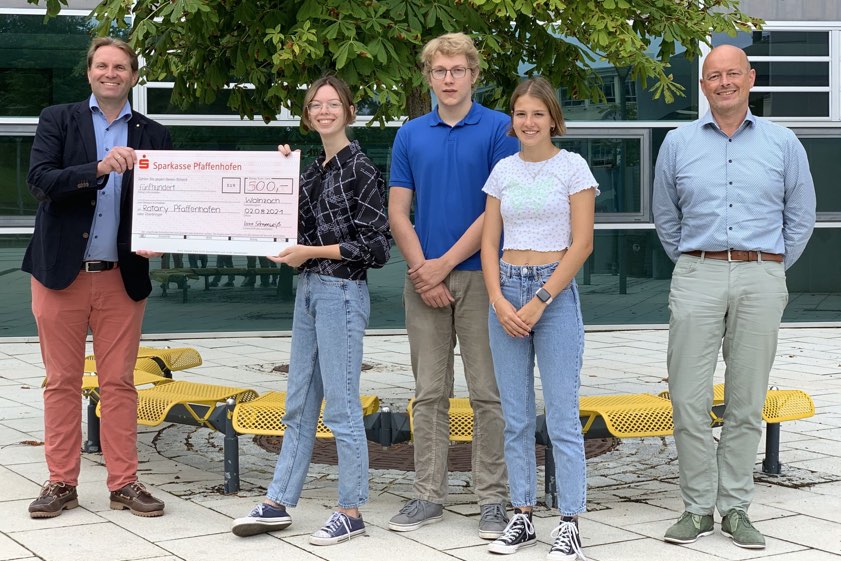 (ty) Aufgrund der aktuellen Situation in den vom Hochwasser so sehr betroffenen Gebieten hat sich die SMV des Hallertau-Gymnasium in Wolnzach dazu entschlossen, für die Flutopfer ans Rotary-Hilfswerk Pfaffenhofen zu spenden. Der hiesige Rotary-Präsident Roman Plöckl nahm den Scheck über 500 Euro von Schul-Leiter Christian Heller sowie den Schüler-Sprechern Joschua Blümelhuber, Lara Schneeweiß und Lara Kirmaier entgegen (Foto oben). Der Betrag komme neben den zusätzlichen Spenden, die vom Rotary-Club Pfaffenhofen geleistet worden seien, direkt den Opfern des am meisten betroffenen Rotary-Disktriks in Nordrhein-Westfalen, Saarland und Rheinland-Pfalz zugute, teilte Plöckl mit.