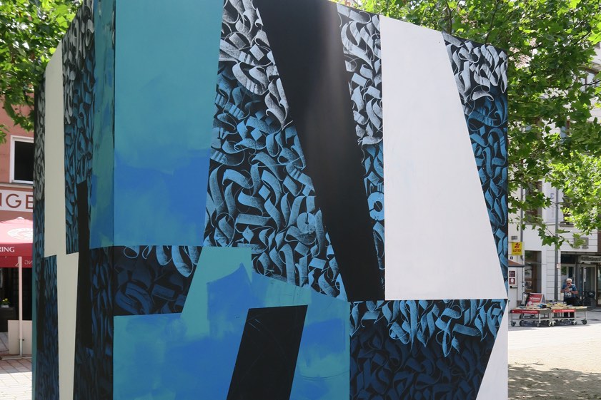 "Krankheitsbedingt kann der Pfaffenhofener Künstler Patrick Hartl, der gemeinsam mit den eingeladenen Künstlern den Würfel bemalen wollte, an den Umgestaltungen nicht mehr teilnehmen", erklärte die Stadtverwaltung. "Um dennoch das ursprüngliche Konzept der Kooperation aufrecht zu erhalten, lässt Matthias Edlinger Teile des bereits bemalten Würfels stehen und arbeitet seine Ideen in das Objekt ein." (Foto: Stadtverwaltung)