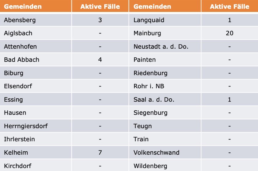 (ty) Im Kreis Kelheim gibt es in Zusammenhang mit der Corona-Pandemie, wie berichtet, mittlerweile 110 Menschenleben zu beklagen. Die weitere Situation stellt sich wie folgt dar: Unter Verweis auf Daten des Gesundheitsamts teilte das Landratsamt heute mit, dass – Stand gestern, 16 Uhr – die Zahl der im Kreis Kelheim positiv auf den neuartigen Erreger getesteten Menschen bei insgesamt 6092 liegt: einer mehr als gestern gemeldet. Bekanntlich wurde im Kreis Kelheim auch bereits die so genannte Delta-Variante nachgewiesen. Insgesamt 5946 hiesige Corona-Patienten (gestern: 5945) wurden wieder aus der Quarantäne entlassen und gelten als genesen. Derzeit gebe es 36 aktive Corona-Fälle im Landkreis (gestern: 36). Zahlen aus den einzelnen Gemeinden zeigt die Tabelle unten.