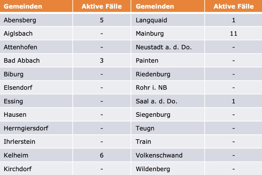 (ty) Im Kreis Kelheim gibt es in Zusammenhang mit der Corona-Pandemie, wie berichtet, mittlerweile 110 Menschenleben zu beklagen. Die weitere Situation stellt sich wie folgt dar: Unter Verweis auf Daten des Gesundheitsamts teilte das Landratsamt heute mit, dass – Stand gestern, 16 Uhr – die Zahl der im Kreis Kelheim positiv auf den neuartigen Erreger getesteten Menschen bei insgesamt 6094 liegt: Das sind vier mehr als am Freitag gemeldet. Bekanntlich wurde im Kreis Kelheim auch bereits die so genannte Delta-Variante nachgewiesen. Insgesamt 5957 hiesige Corona-Patienten (Freitag: 5946) wurden wieder aus der Quarantäne entlassen und gelten als genesen. Derzeit gebe es 27 aktive Corona-Fälle im Landkreis (Freitag: 36). Zahlen aus den einzelnen Gemeinden zeigt die Tabelle unten.