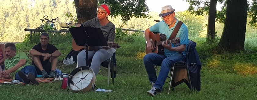 (ty) Fast 40 Leute hatten sich am gestrigen Abend vor der bekannten Wallfahrtskirche in Herrnrast bei Ilmmünster zusammengefunden, um unter dem Motto "Einfach singen!" miteinander Lieder aus aller Welt zum Besten zu geben (Foto oben). Dabei ging es "keinesfalls um Perfektion, sondern einfach um die Freude am Singen und Sich-Ausprobieren", betonte die Initiatorin Karin Hoisl-Schmidt. "Singen ist gesund und macht glücklich. Auch Gasttöne sind willkommen", sagt die Gesundheits-Psychologin aus Ilmmünster, die mit Gitarre und Trommel angerückt war, um – mit Unterstützung ihres Gatten Thomas Schmidt – die Lieder zu begleiten (Foto unten).