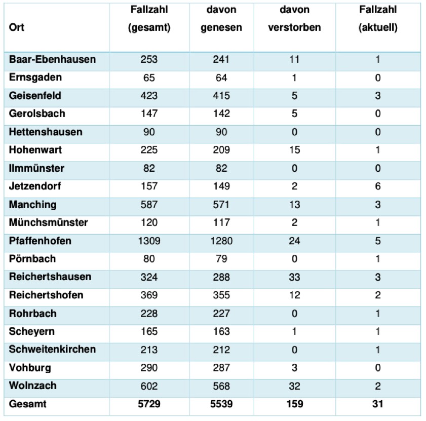 (ty) In Zusammenhang mit der Corona-Pandemie gibt es im Kreis Pfaffenhofen, wie berichtet, mittlerweile 159 Menschenleben zu beklagen. Das Landratsamt veröffentlicht eine tägliche Übersicht (Tabelle unten), in welchen Gemeinden die mit dem Virus infizierten Menschen, die gestorben sind, gelebt haben beziehungsweise wie viele bestätigte Infektionsfälle und genesene Patienten es in welcher Kommune gibt. Die Zahl der Landkreis-Bürger, die positiv auf den neuartigen Erreger getestet worden sind, hat sich seit der Meldung von gestern um einen erhöht und beträgt somit aktuell 5729.