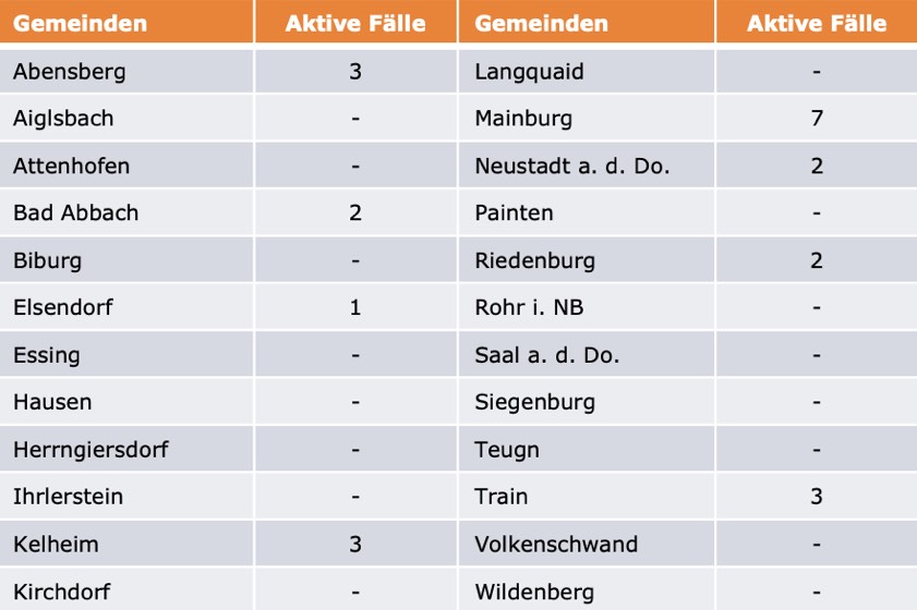 (ty) Im Kreis Kelheim gibt es in Zusammenhang mit der Corona-Pandemie, wie berichtet, mittlerweile 110 Menschenleben zu beklagen. Die weitere Situation stellt sich wie folgt dar: Unter Verweis auf Daten des Gesundheitsamts teilte das Landratsamt heute mit, dass – Stand gestern, 16 Uhr – die Zahl der im Kreis Kelheim positiv auf den neuartigen Erreger getesteten Menschen bei insgesamt 6105 liegt: Das sind vier mehr als gestern gemeldet. Bekanntlich wurde im Kreis Kelheim auch bereits die so genannte Delta-Variante nachgewiesen. Insgesamt 5972 hiesige Corona-Patienten (gestern: 5969) wurden wieder aus der Quarantäne entlassen und gelten als genesen. Derzeit gebe es 23 aktive Corona-Fälle im Landkreis (gestern: 22). Zahlen aus den einzelnen Gemeinden zeigt die Tabelle unten.
