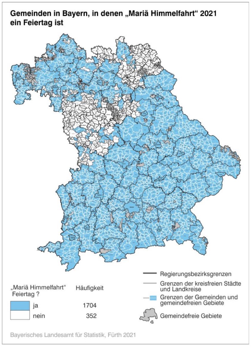 Die aktuelle Festlegung, in welchen Gemeinden im Freistaat Bayern "Mariä Himmelfahrt" ein gesetzlicher Feiertag ist, beruhe auf den Ergebnissen des Zensus 2011. Nach Mitteilung des bayerischen Landesamts für Statistik ist das Fest "Mariä Himmelfahrt" in 1 704 von insgesamt 2 056 Gemeinden Bayerns ein gesetzlicher Feiertag. In Oberbayern und Niederbayern sei der 15. August überall ein Feiertag, da dort in allen Gemeinden zum Zeitpunkt des Zensus 2011 die Zahl der Katholiken überwogen habe.