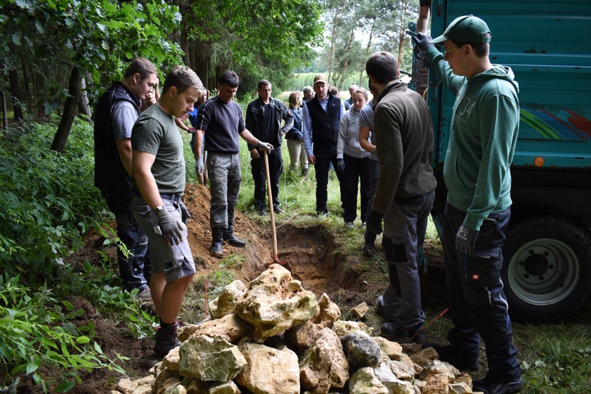 Nach einer kurzen Kennenlern-Runde innerhalb des Teams verteilten die Lehrkräfte, geleitet von Sebastian Gresset als Organisator des Projekts, die insgesamt sechs Aufgaben an die 30 Studierenden. "Mit Schaufeln, Motorsensen, Traktoren und jeder Menge fleißigen Händen entstanden so an sechs Punkten etwa 500 Meter westlich der Ortskapelle Eichelberg neue Tierlebensräume, die nun natürlich auch von Wanderern besucht werden können", fasst das AELF zusammen.