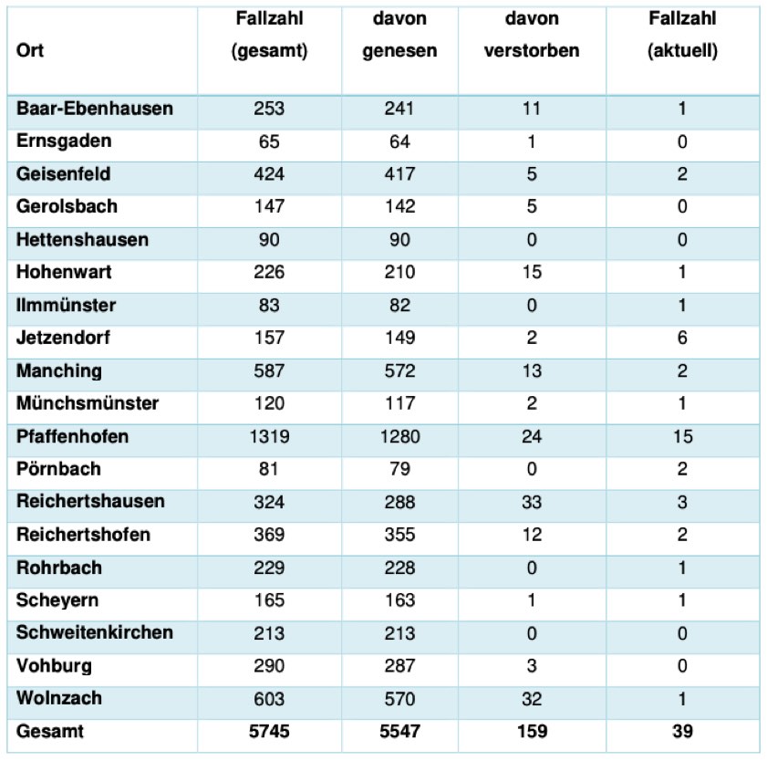 (ty) In Zusammenhang mit der Corona-Pandemie gibt es im Kreis Pfaffenhofen, wie berichtet, mittlerweile 159 Menschenleben zu beklagen. Das Landratsamt veröffentlicht eine tägliche Übersicht (Tabelle unten), in welchen Gemeinden die mit dem Virus infizierten Menschen, die gestorben sind, gelebt haben beziehungsweise wie viele bestätigte Infektionsfälle und genesene Patienten es in welcher Kommune gibt. Die Zahl der Landkreis-Bürger, die positiv auf den neuartigen Erreger getestet worden sind, hat sich seit der Meldung von Freitag um 16 erhöht und beträgt somit aktuell 5745.