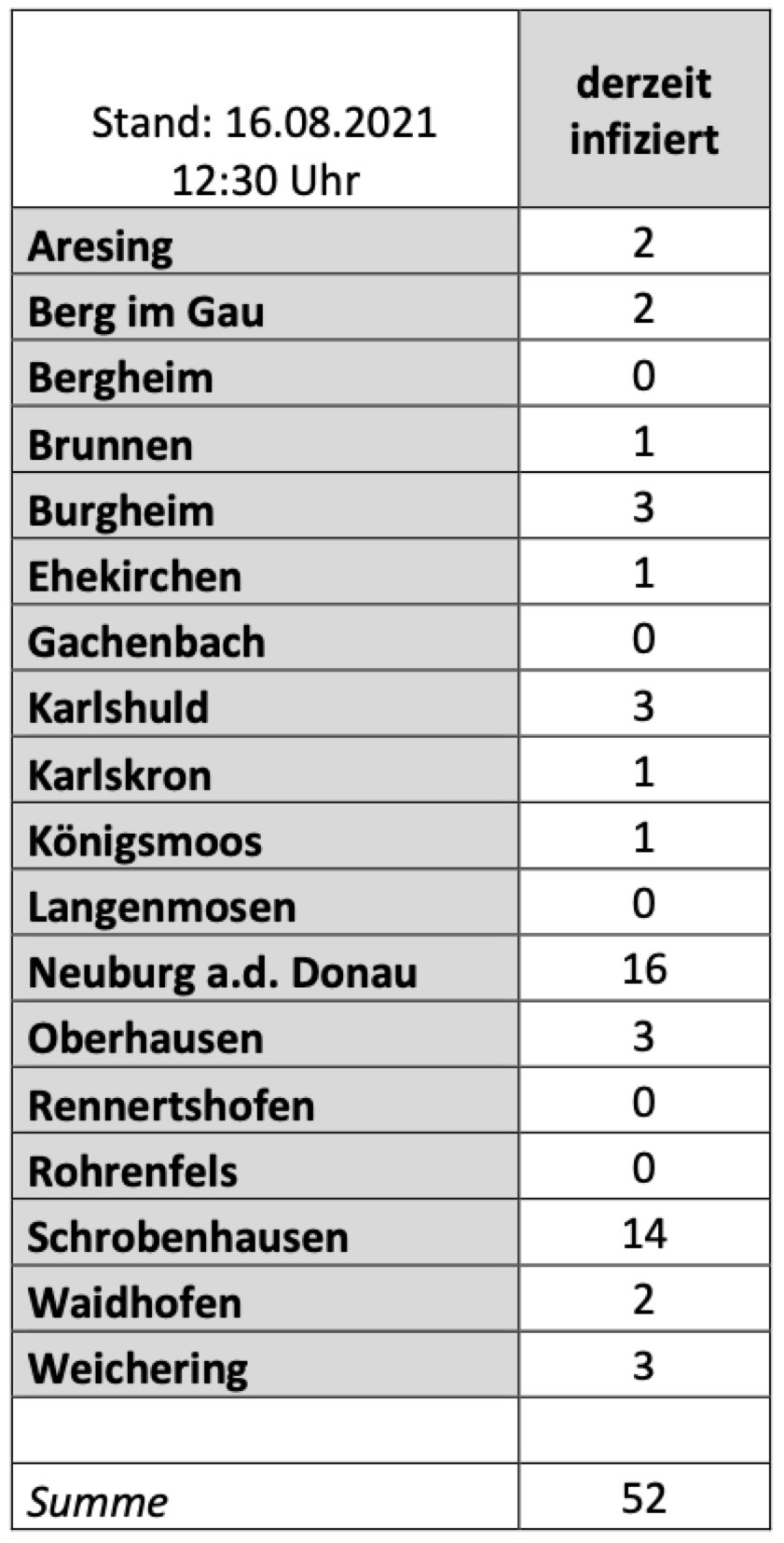 (ty) Im Kreis Neuburg-Schrobenhausen gibt es in Zusammenhang mit der Corona-Pandemie, wie berichtet, mittlerweile 82 Menschenleben zu beklagen. Die weitere Situation in dem Kreis stellt sich laut aktuellen Angaben des Landratsamts wie folgt dar: Bislang – Stand: heute, 12.30 Uhr – wurden insgesamt 4264 Landkreis-Bürger positiv auf den neuartigen Erreger getestet. Das ist einer mehr als gestern gemeldet. Mittlerweile wurde bekanntlich auch die so genannte Delta-Variante im Landkreis nachgewiesen. Von den Infizierten gelten mittlerweile 4130 als genesen – unverändert seit gestern. Momentan gebe es im Landkreis 52 aktive Corona-Fälle (gestern: 51). Aktuelle Zahlen aus den Gemeinden zeigt die Tabelle unten.