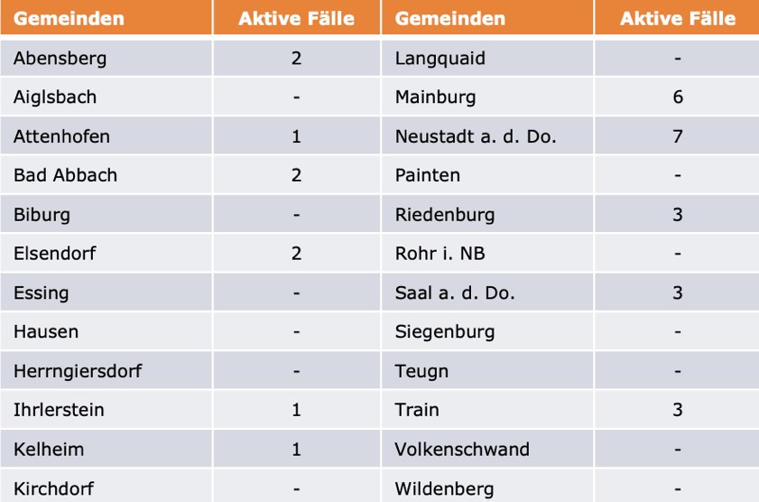 (ty) Im Kreis Kelheim gibt es in Zusammenhang mit der Corona-Pandemie, wie berichtet, mittlerweile 110 Menschenleben zu beklagen. Die weitere Situation stellt sich wie folgt dar: Unter Verweis auf Daten des Gesundheitsamts teilte das Landratsamt heute mit, dass – Stand gestern, 16 Uhr – die Zahl der im Kreis Kelheim positiv auf den neuartigen Erreger getesteten Menschen bei insgesamt 6121 liegt: Das sind fünf mehr als gestern gemeldet. Bekanntlich wurde im Kreis Kelheim auch bereits die so genannte Delta-Variante nachgewiesen. Insgesamt 5980 hiesige Corona-Patienten (gestern: 5978) wurden wieder aus der Quarantäne entlassen und gelten als genesen. Derzeit gebe es 31 aktive Corona-Fälle im Landkreis (gestern: 28). Zahlen aus den einzelnen Gemeinden zeigt die Tabelle unten.