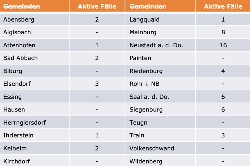 (ty) Im Kreis Kelheim gibt es in Zusammenhang mit der Corona-Pandemie, wie berichtet, mittlerweile 110 Menschenleben zu beklagen. Die weitere Situation stellt sich wie folgt dar: Unter Verweis auf Daten des Gesundheitsamts teilte das Landratsamt heute mit, dass – Stand gestern, 16 Uhr – die Zahl der im Kreis Kelheim positiv auf den neuartigen Erreger getesteten Menschen bei insgesamt 6147 liegt: Das sind 26 mehr als gestern gemeldet. Bekanntlich wurde im Kreis Kelheim auch bereits die so genannte Delta-Variante nachgewiesen. Insgesamt 5982 hiesige Corona-Patienten (gestern: 5980) wurden wieder aus der Quarantäne entlassen und gelten als genesen. Derzeit gebe es 55 aktive Corona-Fälle im Landkreis (gestern: 31). Zahlen aus den einzelnen Gemeinden zeigt die Tabelle unten.