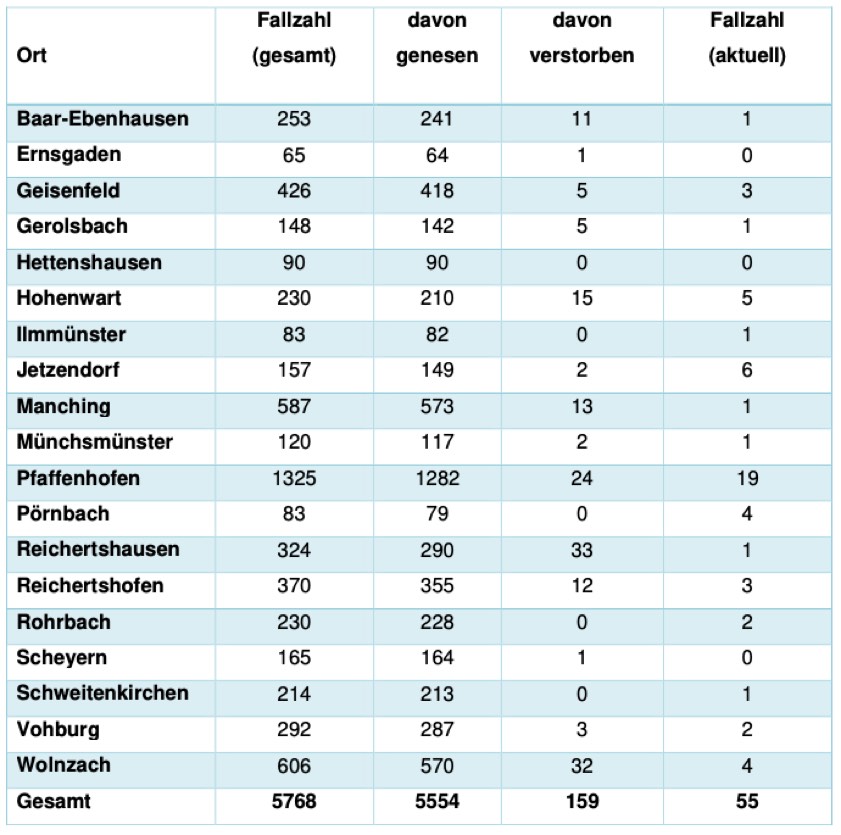 (ty) In Zusammenhang mit der Corona-Pandemie gibt es im Kreis Pfaffenhofen, wie berichtet, mittlerweile 159 Menschenleben zu beklagen. Das Landratsamt veröffentlicht eine tägliche Übersicht (Tabelle unten), in welchen Gemeinden die mit dem Virus infizierten Menschen, die gestorben sind, gelebt haben beziehungsweise wie viele bestätigte Infektionsfälle und genesene Patienten es in welcher Kommune gibt. Die Zahl der Landkreis-Bürger, die positiv auf den neuartigen Erreger getestet worden sind, hat sich seit der Meldung von gestern um zehn erhöht (Vortag: plus zehn) und beträgt somit aktuell 5768.