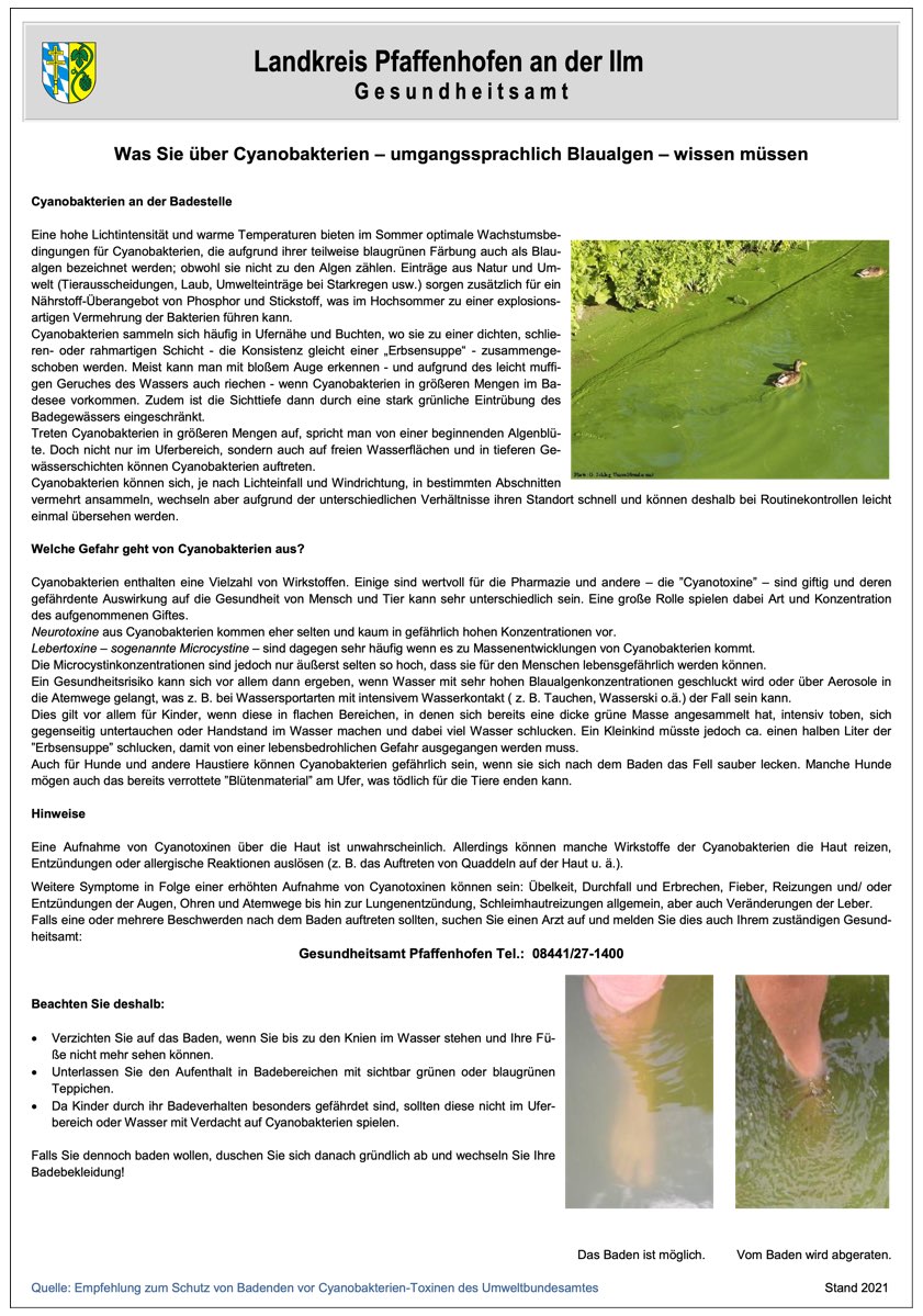 (ty) Für den gesamten Ebenhausener Weiher gilt aufgrund der starken Blaualgen-Ausbreitung bis auf Weiteres ein Bade-Verbot. Das wurde am heutigen Nachmittag aus dem Pfaffenhofener Landratsamt mitgeteilt. Wie berichtet, war für den Kinder-Badebereich dieses Gewässers bereits in der vergangenen Woche ein Bade-Verbot verhängt worden. Nun ist das gesamte Gewässer tabu. "Leider haben sich die Blaualgen-Ansammlungen mittlerweile über den gesamten See verteilt, sodass wir das Bade-Verbot auf den kompletten Weiher ausweiten mussten", heißt es dazu aus dem hiesigen Gesundheitsamt.