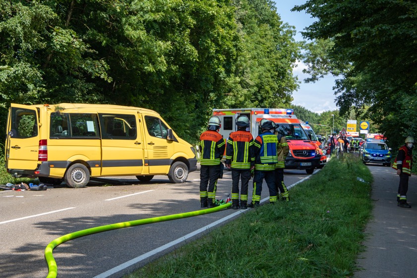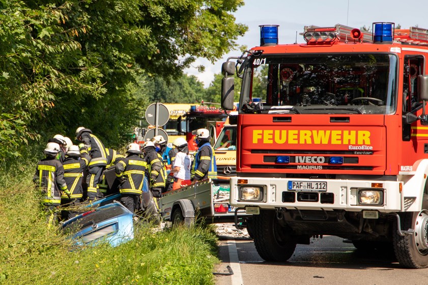 (ty) Ein heftiger Verkehrsunfall, in den ein Pkw und zwei Kleinbusse verwickelt waren, hat am heutigen Nachmittag in Pfaffenhofen insgesamt elf Verletzte gefordert. Das Unglück geschah kurz vor 14 Uhr auf der Staatsstraße 2045. Ein 65-Jähriger geriet mit seinem Opel samt Anhänger auf die Gegenspur und kollidierte frontal mit dem Kleinbus einer Familie. Von den acht Kleinbus-Insassen wurden drei leicht verletzt, eine weitere Person mittelschwer. Der Pkw des Crash-Verursachers kollidierte dann mit einem weiteren Kleinbus, mit dem seine sechsköpfige Familie unterwegs war – alle sechs Personen trugen leichte Verletzungen davon. Der 65-Jährige wurde eingeklemmt und schwer verletzt. Die Straße war 2,5 Stunden komplett gesperrt, ein Großaufgebot von Einsatzkräften war vor Ort.