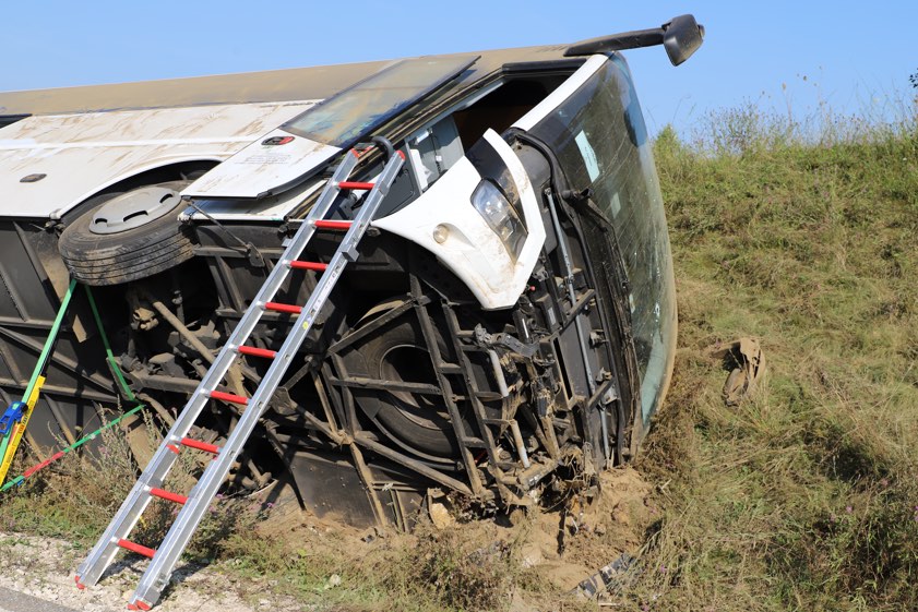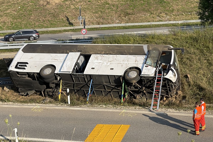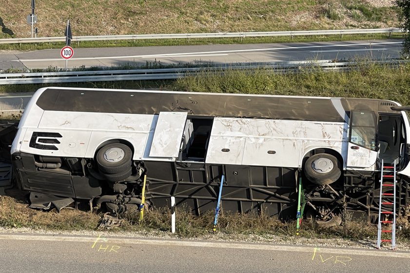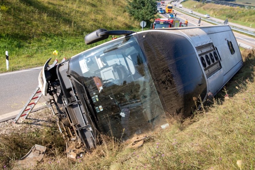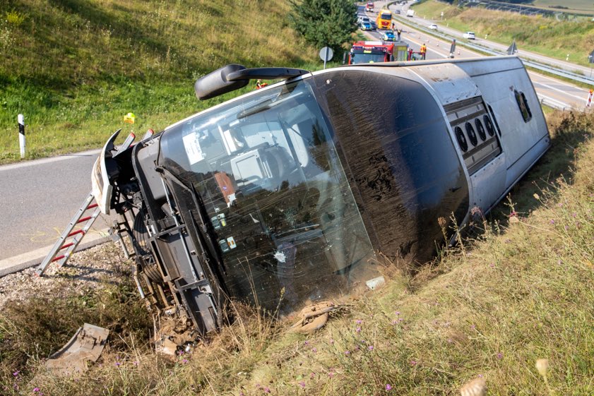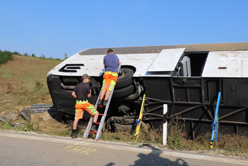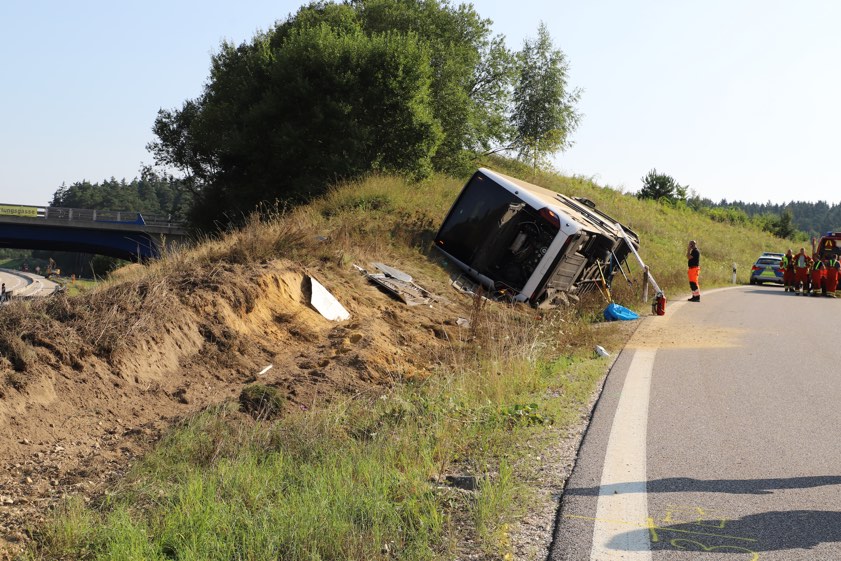 Bus kippte am heutigen Morgen bei Saalhaupt auf der Abfahrt von der A93 zur B15n um. Gruppe aus Tschechien war auf dem Weg von Italien nach Prag.