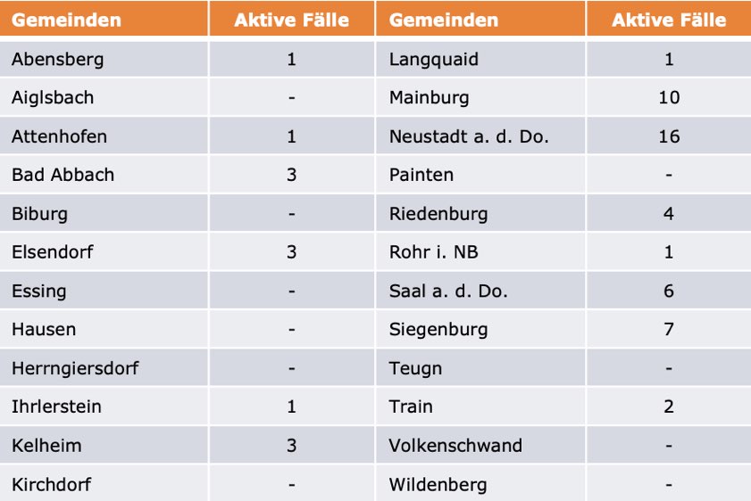(ty) Im Kreis Kelheim gibt es in Zusammenhang mit der Corona-Pandemie, wie berichtet, mittlerweile 110 Menschenleben zu beklagen. Die weitere Situation stellt sich wie folgt dar: Unter Verweis auf Daten des Gesundheitsamts teilte das Landratsamt heute mit, dass – Stand gestern, 16 Uhr – die Zahl der im Kreis Kelheim positiv auf den neuartigen Erreger getesteten Menschen bei insgesamt 6156 liegt: Das sind fünf mehr als gestern gemeldet. Bekanntlich wurde im Kreis Kelheim auch bereits die so genannte Delta-Variante nachgewiesen. Insgesamt 5987 hiesige Corona-Patienten (gestern: 5985) wurden wieder aus der Quarantäne entlassen und gelten als genesen. Derzeit gebe es 59 aktive Corona-Fälle im Landkreis (gestern: 56). Zahlen aus den einzelnen Gemeinden zeigt die Tabelle unten. Inzidenz-bedingt gelten im Landkreis ab Montag, 23. August, strengere Regeln.