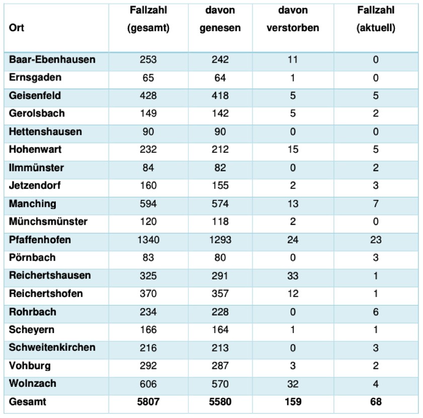 (ty) In Zusammenhang mit der Corona-Pandemie gibt es im Kreis Pfaffenhofen, wie berichtet, mittlerweile 159 Menschenleben zu beklagen. Das Landratsamt veröffentlicht eine tägliche Übersicht (Tabelle unten), in welchen Gemeinden die mit dem Virus infizierten Menschen, die gestorben sind, gelebt haben beziehungsweise wie viele bestätigte Infektionsfälle und genesene Patienten es in welcher Kommune gibt. Die Zahl der Landkreis-Bürger, die positiv auf den neuartigen Erreger getestet worden sind, hat sich seit der Meldung von gestern um 16 erhöht und beträgt somit aktuell 5807.