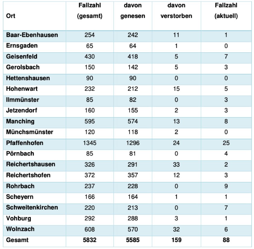 (ty) In Zusammenhang mit der Corona-Pandemie gibt es im Kreis Pfaffenhofen, wie berichtet, mittlerweile 159 Menschenleben zu beklagen. Das Landratsamt veröffentlicht eine tägliche Übersicht (Tabelle unten), in welchen Gemeinden die mit dem Virus infizierten Menschen, die gestorben sind, gelebt haben beziehungsweise wie viele bestätigte Infektionsfälle und genesene Patienten es in welcher Kommune gibt. Die Zahl der Landkreis-Bürger, die positiv auf den neuartigen Erreger getestet worden sind, hat sich seit der Meldung von gestern um 25 erhöht (Vortag: plus 16) und beträgt somit aktuell 5832.