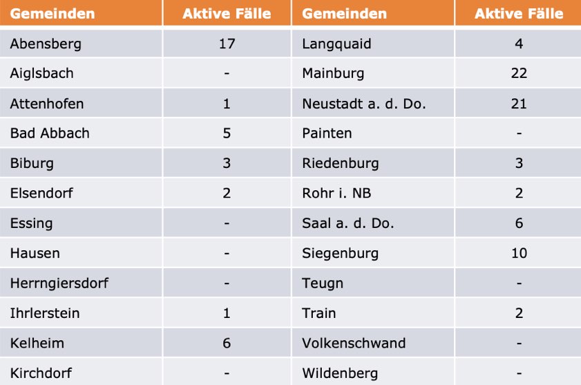 (ty) Im Kreis Kelheim gibt es in Zusammenhang mit der Corona-Pandemie, wie berichtet, mittlerweile 110 Menschenleben zu beklagen. Die weitere Situation stellt sich wie folgt dar: Unter Verweis auf Daten des Gesundheitsamts teilte das Landratsamt heute mit, dass – Stand gestern, 16 Uhr – die Zahl der im Kreis Kelheim positiv auf den neuartigen Erreger getesteten Menschen bei insgesamt 6220 liegt: Das sind 17 mehr als gestern gemeldet. Bekanntlich wurde im Kreis Kelheim auch bereits die so genannte Delta-Variante nachgewiesen. Insgesamt 6005 hiesige Corona-Patienten (gestern: 6000) wurden wieder aus der Quarantäne entlassen und gelten als genesen. Derzeit gebe es 105 aktive Corona-Fälle im Landkreis (gestern: 93). Zahlen aus den einzelnen Gemeinden zeigt die Tabelle unten. Inzidenz-bedingt gelten im Landkreis seit 23. August strengere Regeln.
