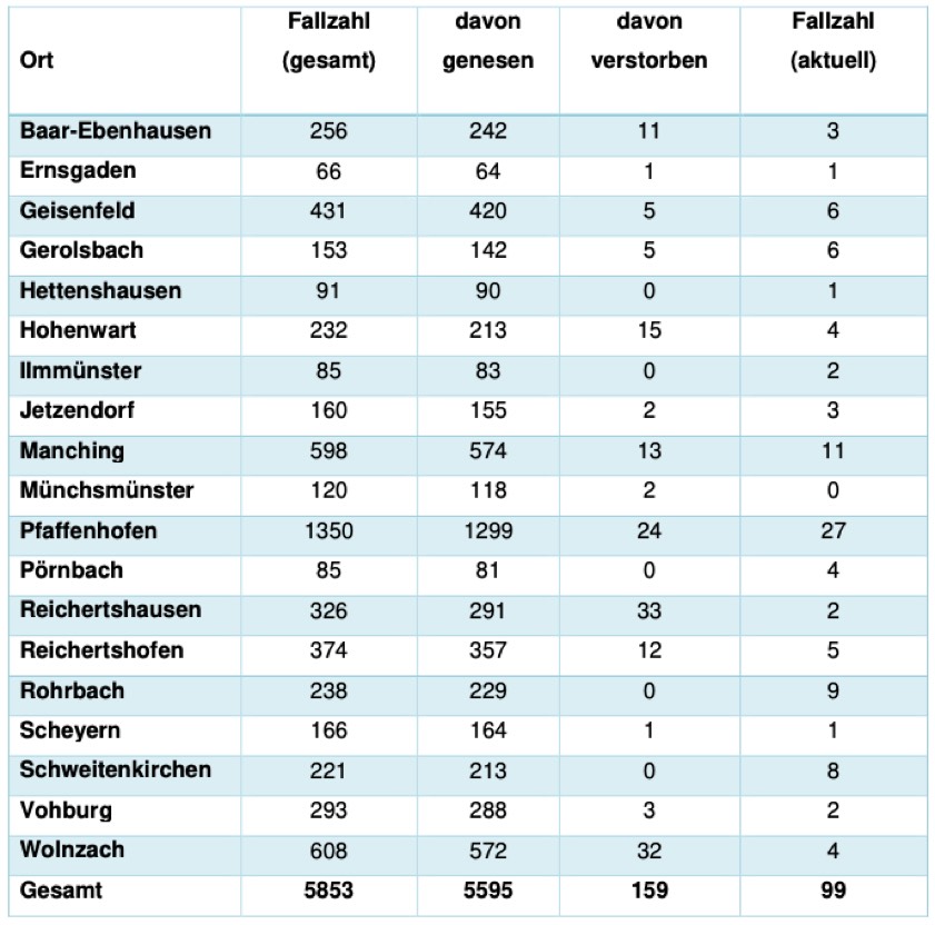 (ty) In Zusammenhang mit der Corona-Pandemie gibt es im Kreis Pfaffenhofen, wie berichtet, mittlerweile 159 Menschenleben zu beklagen. Das Landratsamt veröffentlicht eine tägliche Übersicht (Tabelle unten), in welchen Gemeinden die mit dem Virus infizierten Menschen, die gestorben sind, gelebt haben beziehungsweise wie viele bestätigte Infektionsfälle und genesene Patienten es in welcher Kommune gibt. Die Zahl der Landkreis-Bürger, die positiv auf den neuartigen Erreger getestet worden sind, hat sich seit der Meldung von gestern um 21 erhöht (Vortage: plus 25, plus 16) und beträgt somit aktuell 5853. Inzidenz-bedingt gelten ab 29. August im Landkreis strengere Corona-Regeln (Details siehe unten).