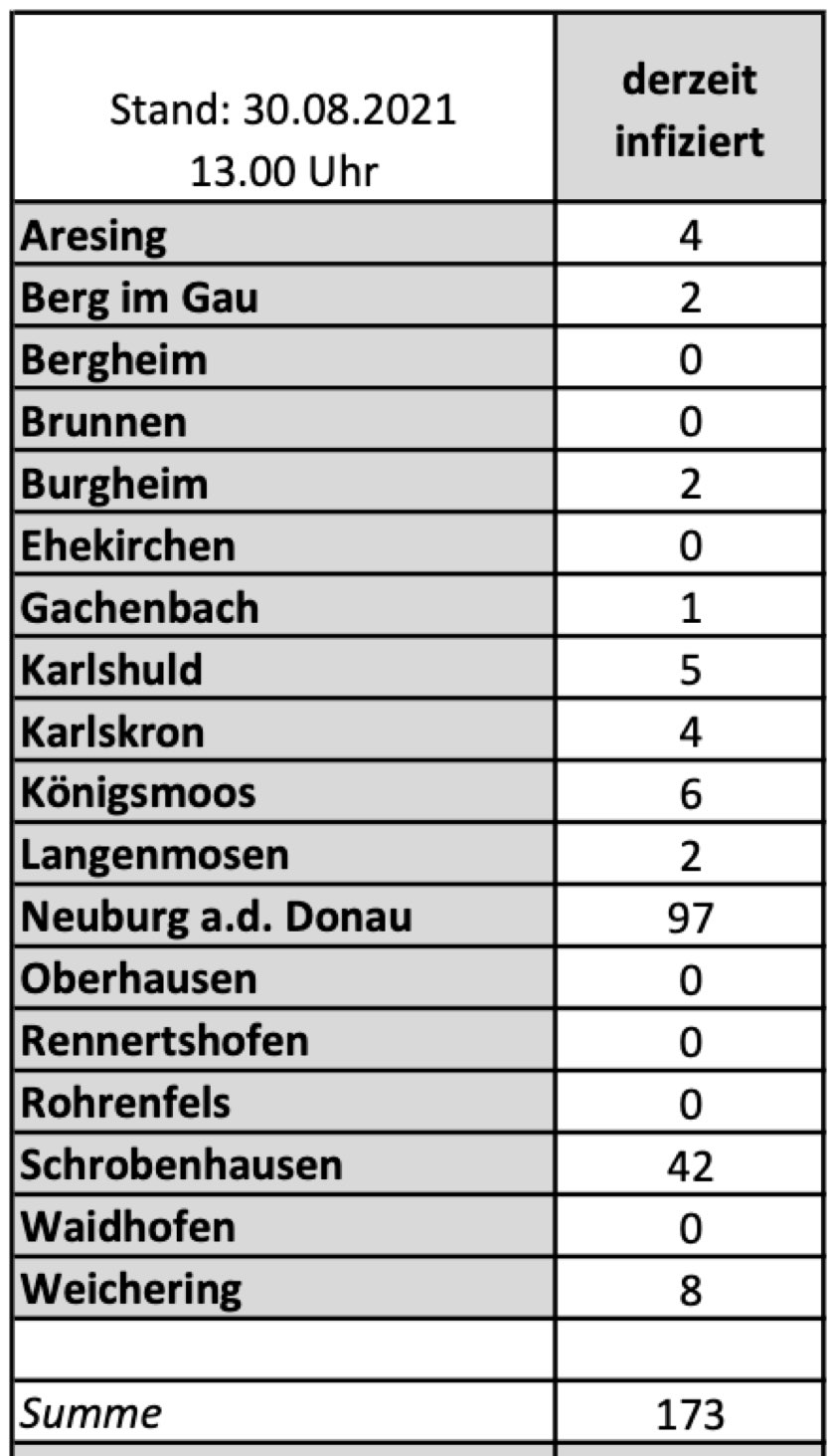 (ty) Im Kreis Neuburg-Schrobenhausen gibt es in Zusammenhang mit der Corona-Pandemie, wie berichtet, mittlerweile 82 Menschenleben zu beklagen. Die weitere Situation in dem Kreis stellt sich laut aktuellen Angaben des Landratsamts wie folgt dar: Bislang – Stand: heute, 13 Uhr – wurden insgesamt 4431 Landkreis-Bürger positiv auf den neuartigen Erreger getestet. Das sind zwei mehr als gestern gemeldet (Vortage: plus sechs, plus 13, plus 13, plus 14, plus 31). Von den Infizierten gelten mittlerweile 4176 als genesen – drei mehr als gestern. Momentan gebe es im Landkreis 173 aktive Corona-Fälle (gestern: 174). Aktuelle Zahlen aus den Gemeinden zeigt die Tabelle unten. Inzidenz-bedingt gelten im Landkreis seit 23. August verschärfte Regeln (Hier die Details: Diese verschärften Corona-Regeln gelten jetzt im Kreis Neuburg-Schrobenhausen ).
