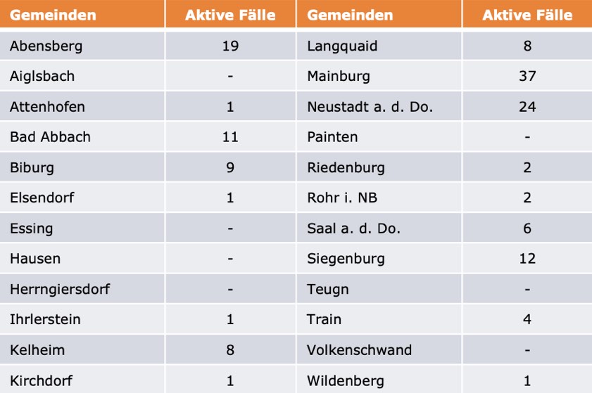 (ty) Im Kreis Kelheim gibt es in Zusammenhang mit der Corona-Pandemie, wie berichtet, mittlerweile 110 Menschenleben zu beklagen. Die weitere Situation stellt sich wie folgt dar: Unter Verweis auf Daten des Gesundheitsamts teilte das Landratsamt heute mit, dass – Stand gestern, 16 Uhr – die Zahl der im Kreis Kelheim positiv auf den neuartigen Erreger getesteten Menschen bei insgesamt 6275 liegt: Das sind 17 mehr als gestern gemeldet (Vortage: plus 19, plus 19, plus 17). Insgesamt 6018 hiesige Corona-Patienten (gestern: 6013) wurden wieder aus der Quarantäne entlassen und gelten als genesen. Derzeit gebe es 147 aktive Corona-Fälle im Landkreis (gestern: 135). Zahlen aus den einzelnen Gemeinden zeigt die Tabelle unten. Inzidenz-bedingt gelten im Landkreis seit 23. August strengere Regeln, eine weitere Verschärfung greift ab 31. August.