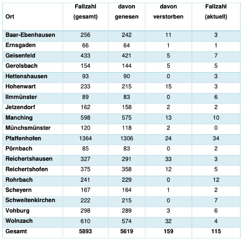 Von den bislang insgesamt 5893 Menschen aus dem Kreis Pfaffenhofen, bei denen nach jüngstem offiziellen Stand eine Corona-Infektion bestätigt worden ist, gelten laut aktueller Mitteilung der Behörde mittlerweile 5619 als genesen – das sind neun mehr als gestern gemeldet. Die Zahl der infizierten und noch nicht genesenen Corona-Patienten hat sich dadurch im Landkreis verringert und beträgt – Stand: heute Nachmittag – derzeit 115 (gestern: 119). Die infizierten Personen befinden sich in häuslicher Isolation.