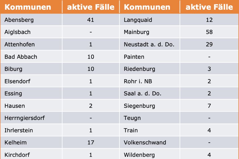(ty) Im Kreis Kelheim gibt es in Zusammenhang mit der Corona-Pandemie, wie berichtet, mittlerweile 110 Menschenleben zu beklagen. Die weitere Situation stellt sich wie folgt dar: Unter Verweis auf Daten des Gesundheitsamts teilte das Landratsamt heute mit, dass – Stand gestern, 16 Uhr – die Zahl der im Kreis Kelheim positiv auf den neuartigen Erreger getesteten Menschen bei insgesamt 6359 liegt: Das sind 43 mehr als gestern gemeldet (Vortage: plus 23, plus 18, plus 17, plus 19, plus 19, plus 17). Insgesamt 6043 hiesige Corona-Patienten (gestern: 6041) wurden wieder aus der Quarantäne entlassen und gelten als genesen. Derzeit gebe es 206 aktive Corona-Fälle im Landkreis (gestern: 165). Zahlen aus den einzelnen Gemeinden zeigt die Tabelle unten. Seit 2. September gelten bayernweit völlig neue Corona-Regeln (Details siehe unten).