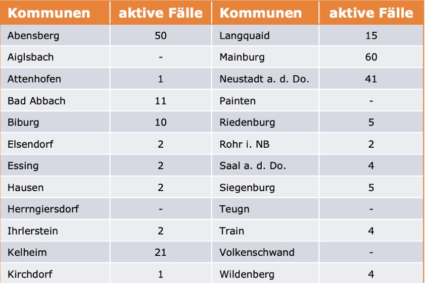 (ty) Im Kreis Kelheim gibt es in Zusammenhang mit der Corona-Pandemie, wie berichtet, mittlerweile 110 Menschenleben zu beklagen. Die weitere Situation stellt sich wie folgt dar: Unter Verweis auf Daten des Gesundheitsamts teilte das Landratsamt heute mit, dass – Stand gestern, 16 Uhr – die Zahl der im Kreis Kelheim positiv auf den neuartigen Erreger getesteten Menschen bei insgesamt 6396 liegt: Das sind 37 mehr als gestern gemeldet (Vortage: plus 43, plus 23, plus 18, plus 17, plus 19, plus 19, plus 17). Insgesamt 6044 hiesige Corona-Patienten (gestern: 6043) wurden wieder aus der Quarantäne entlassen und gelten als genesen. Derzeit gebe es 242 aktive Corona-Fälle im Landkreis (gestern: 206). Zahlen aus den einzelnen Gemeinden zeigt die Tabelle unten. Seit 2. September gelten bayernweit völlig neue Corona-Regeln (Details siehe unten).