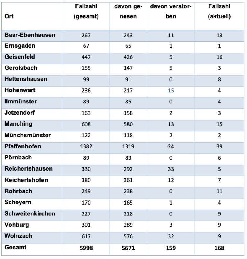 (ty) In Zusammenhang mit der Corona-Pandemie gibt es im Kreis Pfaffenhofen, wie berichtet, mittlerweile 159 Menschenleben zu beklagen. Das Landratsamt veröffentlicht eine tägliche Übersicht (Tabelle unten), in welchen Gemeinden die mit dem Virus infizierten Menschen, die gestorben sind, gelebt haben beziehungsweise wie viele bestätigte Infektionsfälle und genesene Patienten es in welcher Kommune gibt. Die Zahl der Landkreis-Bürger, die positiv auf den neuartigen Erreger getestet worden sind, hat sich seit der Meldung von Freitag um 50 erhöht und beträgt somit aktuell 5998. Seit 2. September gelten bayernweit völlig neue Corona-Regeln (Details siehe unten).