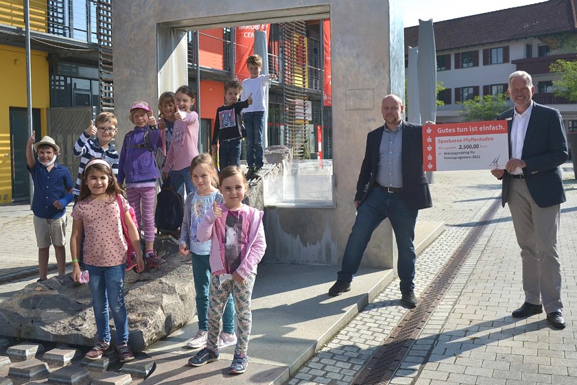 (ty) Einen Blick hinter die Kulissen der Sparkasse von Pfaffenhofen haben im Rahmen des vom hiesigen Kreisjugendring (KJR) angebotenen Ferien-Programms insgesamt 20 Mädchen und Buben geworfen. Aber auch der KJR selbst durfte sich freuen: Der zuständige Markt-Direktor Michael Hoyer überreichte an den KJR-Vorsitzenden Andre Gersdorf einen Spenden-Scheck über 2500 Euro. "Die Sparkasse leistet mit ihrer großzügigen Spende einen wesentlichen Beitrag dazu, dass das Ferien-Programm für die Kinder kostenlos ist", betonte Gersdorf. Corona-bedingt mussten die "Ferienpass-Kinder" laut Sparkasse heuer in zwei Gruppen aufgeteilt werden; deshalb sind auf dem Foto oben nur zehn Kinder zu sehen.