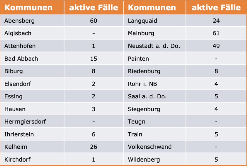 (ty) Im Kreis Kelheim gibt es in Zusammenhang mit der Corona-Pandemie, wie berichtet, mittlerweile 110 Menschenleben zu beklagen. Die weitere Situation stellt sich wie folgt dar: Unter Verweis auf Daten des Gesundheitsamts teilte das Landratsamt heute mit, dass – Stand gestern, 16 Uhr – die Zahl der im Kreis Kelheim positiv auf den neuartigen Erreger getesteten Menschen bei insgesamt 6483 liegt: Das sind 17 mehr als gestern gemeldet. Insgesamt 6084 hiesige Corona-Patienten (gestern: 6074) wurden wieder aus der Quarantäne entlassen und gelten als genesen. Derzeit gebe es 289 aktive Corona-Fälle im Landkreis (gestern: 282). Zahlen aus den einzelnen Gemeinden zeigt die Tabelle unten. Seit 2. September gelten bayernweit völlig neue Corona-Regeln (Details siehe unten).