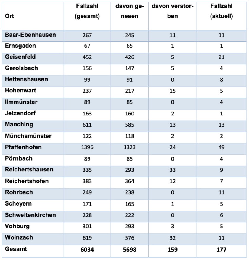 (ty) In Zusammenhang mit der Corona-Pandemie gibt es im Kreis Pfaffenhofen, wie berichtet, mittlerweile 159 Menschenleben zu beklagen. Das Landratsamt veröffentlicht eine tägliche Übersicht (Tabelle unten), in welchen Gemeinden die mit dem Virus infizierten Menschen, die gestorben sind, gelebt haben beziehungsweise wie viele bestätigte Infektionsfälle und genesene Patienten es in welcher Kommune gibt. Die Zahl der Landkreis-Bürger, die positiv auf den neuartigen Erreger getestet worden sind, hat sich seit der Meldung von gestern um 27 erhöht und beträgt somit aktuell 6034. Seit 2. September gelten bayernweit völlig neue Corona-Regeln (Details siehe unten).