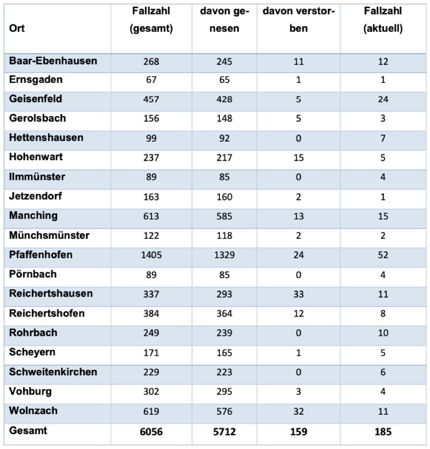 (ty) In Zusammenhang mit der Corona-Pandemie gibt es im Kreis Pfaffenhofen, wie berichtet, mittlerweile 159 Menschenleben zu beklagen. Das Landratsamt veröffentlicht eine tägliche Übersicht (Tabelle unten), in welchen Gemeinden die mit dem Virus infizierten Menschen, die gestorben sind, gelebt haben beziehungsweise wie viele bestätigte Infektionsfälle und genesene Patienten es in welcher Kommune gibt. Die Zahl der Landkreis-Bürger, die positiv auf den neuartigen Erreger getestet worden sind, hat sich seit der Meldung von gestern um 22 erhöht und beträgt somit aktuell 6056. Seit 2. September gelten bayernweit völlig neue Corona-Regeln (Details siehe unten).