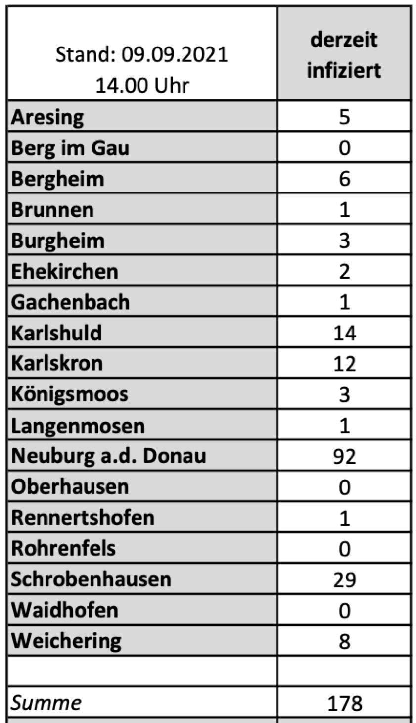 (ty) Im Kreis Neuburg-Schrobenhausen gibt es in Zusammenhang mit der Corona-Pandemie ein weiteres Menschenleben zu beklagen. Wie das Landratsamts heute gegenüber unserer Zeitung erklärte, ist ein Mann im Alter von rund 60 Jahren gestorben, der zum Todeszeitpunkt als corona-positiv galt. Damit erhöht sich die Zahl der Corona-Toten im Landkreis auf nunmehr 83. Die weitere Situation im Kreis stellt sich laut aktuellen Angaben des Landratsamts wie folgt dar: Bislang – Stand: heute, 14 Uhr – wurden insgesamt 4562 Landkreis-Bürger positiv auf den neuartigen Erreger getestet. Das sind 15 mehr als gestern gemeldet (Vortage: 17, 8, 2, 3, 12, 12, 20, 10, 32). Von den Infizierten gelten mittlerweile 4301 als genesen – 20 mehr als gestern. Momentan gebe es im Landkreis 178 aktive Corona-Fälle (gestern: 184). Aktuelle Zahlen aus den Gemeinden zeigt die Tabelle unten. Seit 2. September gelten bayernweit völlig neue Corona-Regeln (Details siehe unten).