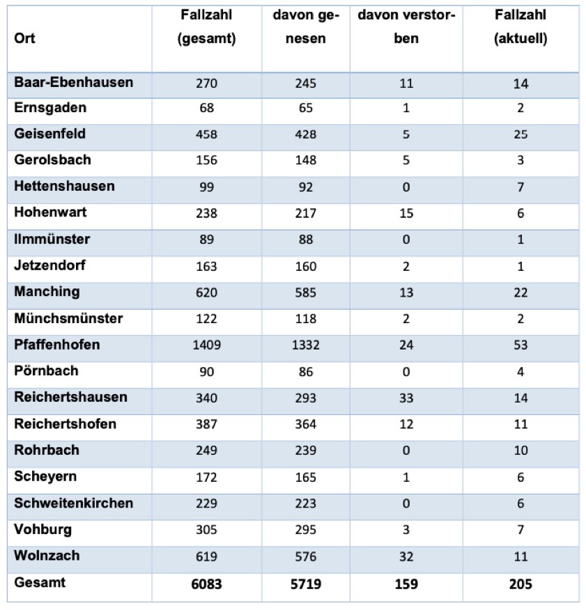 (ty) In Zusammenhang mit der Corona-Pandemie gibt es im Kreis Pfaffenhofen, wie berichtet, mittlerweile 159 Menschenleben zu beklagen. Das Landratsamt veröffentlicht eine tägliche Übersicht (Tabelle unten), in welchen Gemeinden die mit dem Virus infizierten Menschen, die gestorben sind, gelebt haben beziehungsweise wie viele bestätigte Infektionsfälle und genesene Patienten es in welcher Kommune gibt. Die Zahl der Landkreis-Bürger, die positiv auf den neuartigen Erreger getestet worden sind, hat sich seit der Meldung von gestern um 27 erhöht und beträgt somit aktuell 6083. Seit 2. September gelten bayernweit völlig neue Corona-Regeln (Details siehe unten).