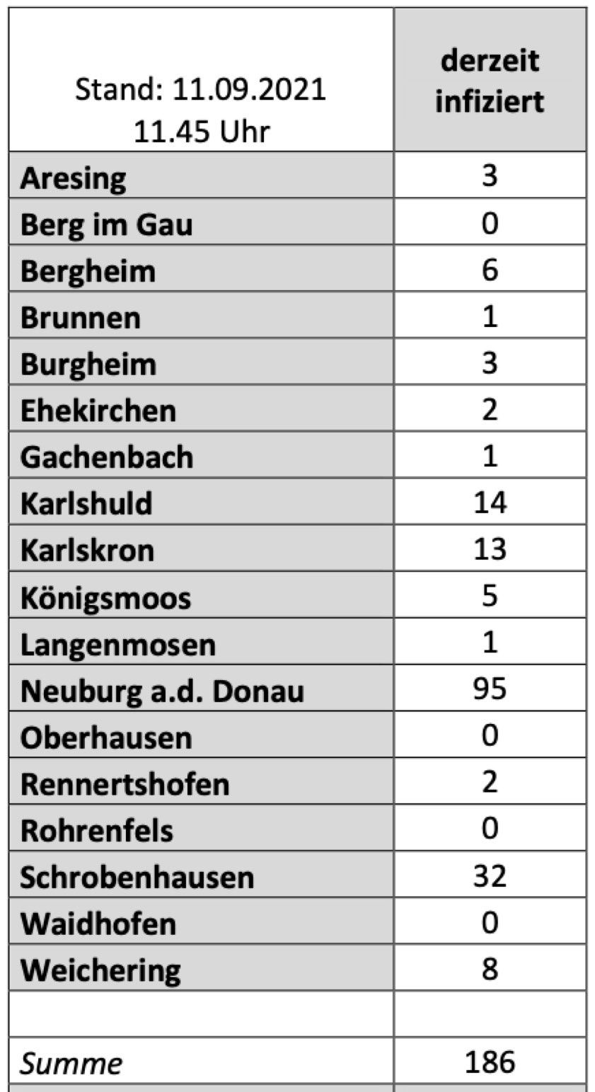 (ty) Im Kreis Neuburg-Schrobenhausen gibt es in Zusammenhang mit der Corona-Pandemie, wie berichtet, mittlerweile 83 Menschenleben zu beklagen. Die weitere Situation im Kreis stellt sich laut aktuellen Angaben des Landratsamts wie folgt dar: Bislang – Stand: heute, 11.45 Uhr – wurden insgesamt 4584 Landkreis-Bürger positiv auf den neuartigen Erreger getestet. Das sind neun mehr als gestern gemeldet (Vortage: 13, 15, 17, 8, 2, 3, 12, 12, 20, 10, 32). Von den Infizierten gelten mittlerweile 4315 als genesen – unverändert seit gestern. Momentan gebe es im Landkreis 186 aktive Corona-Fälle (gestern: 177). Aktuelle Zahlen aus den Gemeinden zeigt die Tabelle unten. Seit 2. September gelten bayernweit völlig neue Corona-Regeln (Details siehe unten).