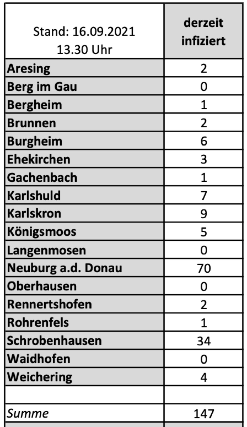 (ty) Im Kreis Neuburg-Schrobenhausen gibt es in Zusammenhang mit der Corona-Pandemie, wie berichtet, mittlerweile 83 Menschenleben zu beklagen. Die weitere Situation im Kreis stellt sich laut aktuellen Angaben des Landratsamts wie folgt dar: Bislang – Stand: heute, 13.30 Uhr – wurden insgesamt 4630 Landkreis-Bürger positiv auf den neuartigen Erreger getestet. Das sind zehn mehr als gestern gemeldet (Vortage: 26, 4, 5, 1, 9, 13, 15, 17, 8). Von den Infizierten gelten mittlerweile 4400 als genesen – 28 mehr als gestern. Momentan gebe es im Landkreis 147 aktive Corona-Fälle (gestern: 165). Aktuelle Zahlen aus den Gemeinden zeigt die Tabelle unten. Seit 2. September gelten bayernweit völlig neue Corona-Regeln (Details siehe unten).