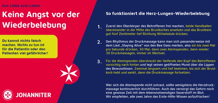 - "Gehören Sie selbst zu einer Corona-Risiko-Gruppe, sollten Sie andere Personen auffordern, Erste-Hilfe zu leisten", so die Johanniter weiter. "Ist niemand in der Nähe, versuchen Sie, so gut es geht und mit angemessenen Sicherheits-Abstand zu helfen."
