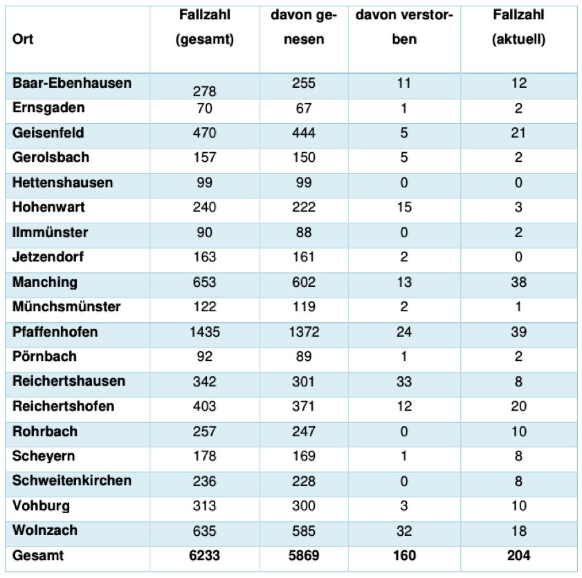 (ty) In Zusammenhang mit der Corona-Pandemie gibt es im Kreis Pfaffenhofen, wie berichtet, mittlerweile 160 Menschenleben zu beklagen. Das Landratsamt veröffentlicht eine tägliche Übersicht (Tabelle unten), in welchen Gemeinden die mit dem Virus infizierten Menschen, die gestorben sind, gelebt haben beziehungsweise wie viele bestätigte Infektionsfälle und genesene Patienten es in welcher Kommune gibt. Die Zahl der Landkreis-Bürger, die positiv auf den neuartigen Erreger getestet worden sind, hat sich seit der Meldung von Freitag um 47 erhöht und beträgt somit aktuell 6233. Seit 2. September gelten bayernweit völlig neue Corona-Regeln (Details siehe unten).