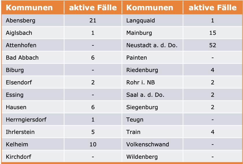 (ty) Im Kreis Kelheim gibt es in Zusammenhang mit der Corona-Pandemie, wie berichtet, mittlerweile 111 Menschenleben zu beklagen. Die weitere Situation stellt sich wie folgt dar: Unter Verweis auf Daten des Gesundheitsamts teilte das Landratsamt heute mit, dass – Stand gestern, 16 Uhr – die Zahl der im Kreis Kelheim positiv auf den neuartigen Erreger getesteten Menschen bei insgesamt 6864 liegt: Das sind zwölf mehr als gestern gemeldet. Insgesamt 6619 hiesige Corona-Patienten (gestern: 6598) wurden wieder aus der Quarantäne entlassen und gelten als genesen. Derzeit gebe es 134 aktive Corona-Fälle im Landkreis (gestern: 143). Zahlen aus den einzelnen Gemeinden zeigt die Tabelle unten. Seit 2. September gelten bayernweit völlig neue Corona-Regeln (Details siehe unten).