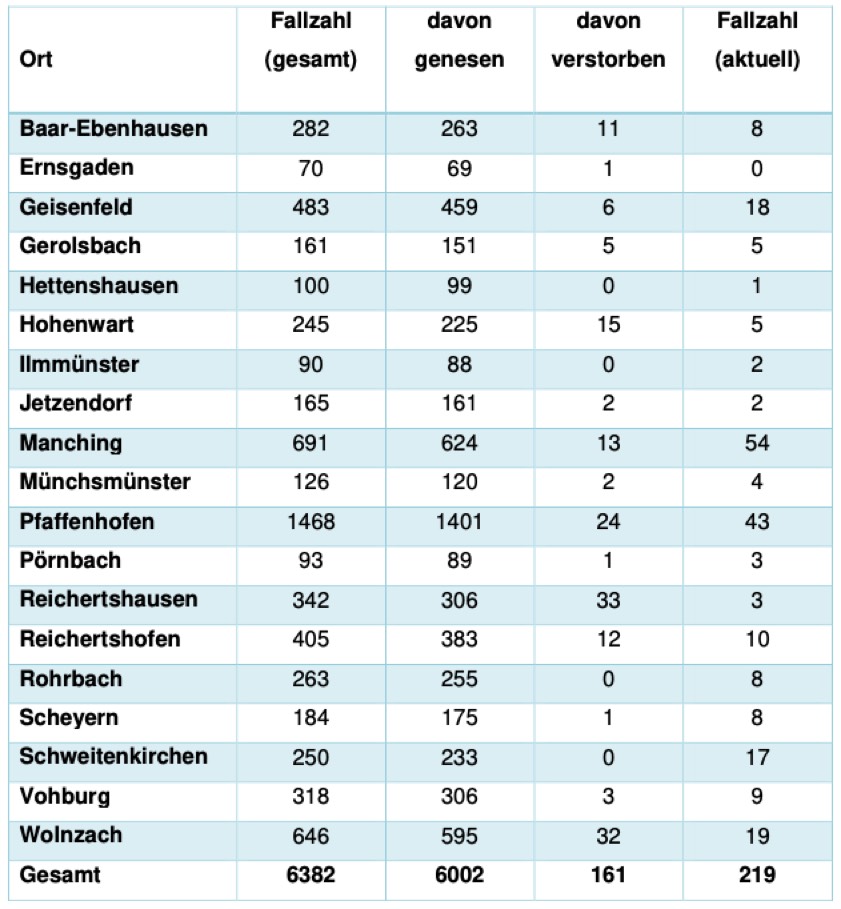 (ty) In Zusammenhang mit der Corona-Pandemie gibt es im Kreis Pfaffenhofen, wie berichtet, mittlerweile 161 Menschenleben zu beklagen. Das Landratsamt veröffentlicht eine tägliche Übersicht (Tabelle unten), in welchen Gemeinden die mit dem Virus infizierten Menschen, die gestorben sind, gelebt haben beziehungsweise wie viele bestätigte Infektionsfälle und genesene Patienten es in welcher Kommune gibt. Die Zahl der Landkreis-Bürger, die positiv auf den neuartigen Erreger getestet worden sind, hat sich seit der Meldung von gestern um 27 erhöht und beträgt somit aktuell 6382. Seit 2. September gelten bayernweit völlig neue Corona-Regeln (Details siehe unten).