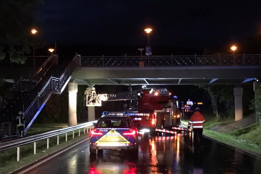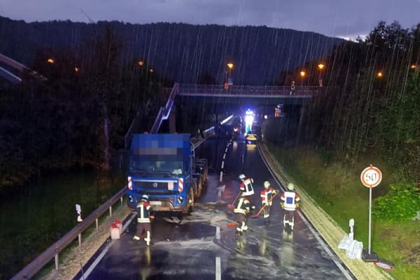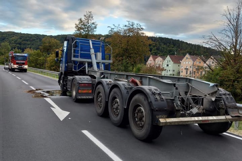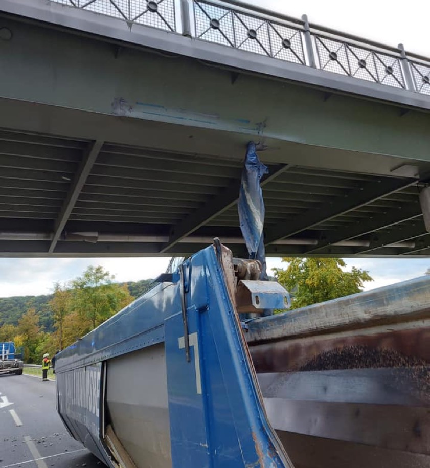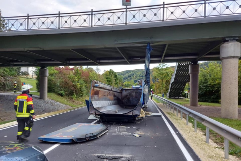 Kipper-Mulde war hochgeklappt, wurde abgerissen. Schaden noch nicht zu beziffern, statische Berechnung steht noch aus. Brücke vorerst nur eingeschränkt befahrbar.