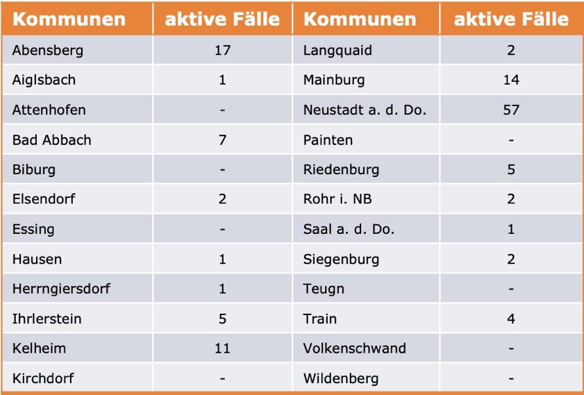 (ty) Im Kreis Kelheim gibt es in Zusammenhang mit der Corona-Pandemie, wie berichtet, mittlerweile 111 Menschenleben zu beklagen. Die weitere Situation stellt sich wie folgt dar: Unter Verweis auf Daten des Gesundheitsamts teilte das Landratsamt heute mit, dass – Stand gestern, 16 Uhr – die Zahl der im Kreis Kelheim positiv auf den neuartigen Erreger getesteten Menschen bei insgesamt 6878 liegt: Das sind 14 mehr als gestern gemeldet. Insgesamt 6635 hiesige Corona-Patienten (gestern: 6619) wurden wieder aus der Quarantäne entlassen und gelten als genesen. Derzeit gebe es 132 aktive Corona-Fälle im Landkreis (gestern: 134). Zahlen aus den einzelnen Gemeinden zeigt die Tabelle unten. Seit 2. September gelten bayernweit völlig neue Corona-Regeln (Details siehe unten).