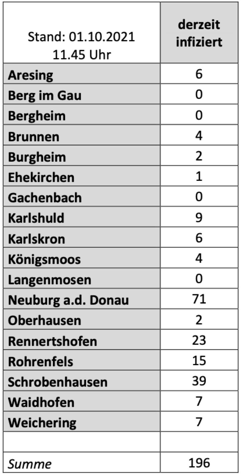 (ty) Im Kreis Neuburg-Schrobenhausen gibt es in Zusammenhang mit der Corona-Pandemie, wie berichtet, mittlerweile 85 Menschenleben zu beklagen. Die weitere Situation im Kreis stellt sich laut aktuellen Angaben des Landratsamts wie folgt dar: Bislang – Stand: heute, 11.45 Uhr – wurden insgesamt 4814 Landkreis-Bürger positiv auf den neuartigen Erreger getestet. Das sind sechs mehr als gestern gemeldet (Vortage: 5, 21, 32, 2, 3, 14, 17, 9, 17, 29). Von den Infizierten gelten mittlerweile 4533 als genesen – neun mehr als gestern. Momentan gebe es im Landkreis 196 aktive Corona-Fälle (gestern: 199). Aktuelle Zahlen aus den Gemeinden zeigt die Tabelle unten. Seit 2. September gelten bayernweit völlig neue Corona-Regeln (Details siehe unten).