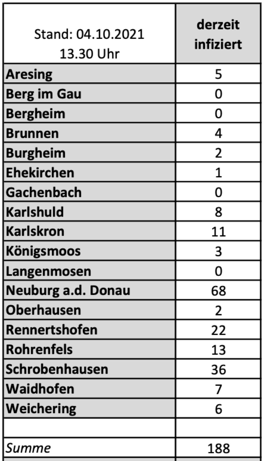 (ty) Im Kreis Neuburg-Schrobenhausen gibt es in Zusammenhang mit der Corona-Pandemie, wie berichtet, mittlerweile 85 Menschenleben zu beklagen. Die weitere Situation im Kreis stellt sich laut aktuellen Angaben des Landratsamts wie folgt dar: Bislang – Stand: heute, 13.30 Uhr – wurden insgesamt 4829 Landkreis-Bürger positiv auf den neuartigen Erreger getestet. Das sind 15 mehr als am Freitag gemeldet. Von den Infizierten gelten mittlerweile 4556 als genesen – 23 mehr als am Freitag. Momentan gebe es im Landkreis 188 aktive Corona-Fälle (Freitag: 196). Aktuelle Zahlen aus den Gemeinden zeigt die Tabelle unten. Seit 2. September gelten bayernweit völlig neue Corona-Regeln (Details siehe unten).