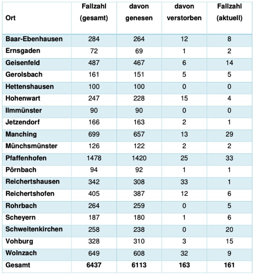 (ty) In Zusammenhang mit der Corona-Pandemie gibt es im Kreis Pfaffenhofen, wie berichtet, mittlerweile 163 Menschenleben zu beklagen. Das Landratsamt veröffentlicht eine tägliche Übersicht (Tabelle unten), in welchen Gemeinden die mit dem Virus infizierten Menschen, die gestorben sind, gelebt haben beziehungsweise wie viele bestätigte Infektionsfälle und genesene Patienten es in welcher Kommune gibt. Die Zahl der Landkreis-Bürger, die positiv auf den neuartigen Erreger getestet worden sind, hat sich seit der Meldung von gestern um drei erhöht und beträgt somit aktuell 6437. Seit 2. September gelten bayernweit völlig neue Corona-Regeln (Details siehe unten).