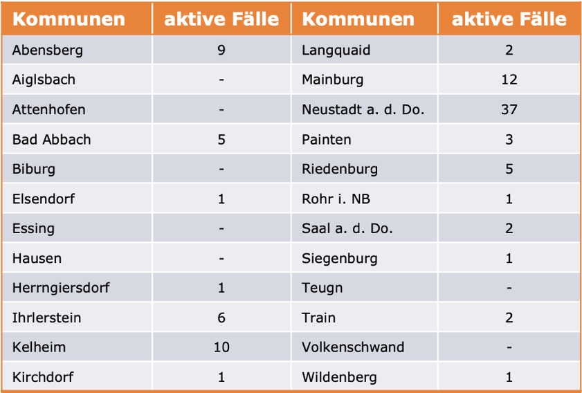 (ty) Im Kreis Kelheim gibt es in Zusammenhang mit der Corona-Pandemie, wie berichtet, mittlerweile 111 Menschenleben zu beklagen. Die weitere Situation stellt sich wie folgt dar: Unter Verweis auf Daten des Gesundheitsamts teilte das Landratsamt heute mit, dass – Stand gestern, 16 Uhr – die Zahl der im Kreis Kelheim positiv auf den neuartigen Erreger getesteten Menschen bei insgesamt 6923 liegt: Das sind zwölf mehr als gestern gemeldet. Insgesamt 6713 hiesige Corona-Patienten (gestern: 6701) wurden wieder aus der Quarantäne entlassen und gelten als genesen. Derzeit gebe es 99 aktive Corona-Fälle im Landkreis (gestern: 99). Zahlen aus den einzelnen Gemeinden zeigt die Tabelle unten. Seit 2. September gelten bayernweit völlig neue Corona-Regeln (Details siehe unten).