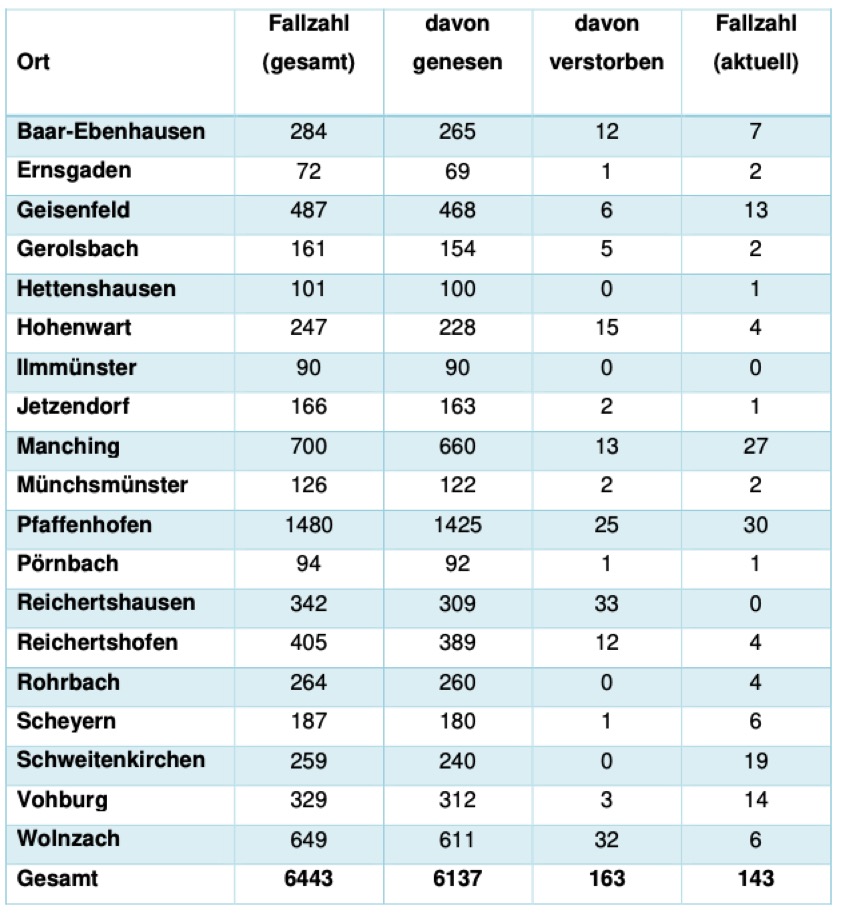 (ty) In Zusammenhang mit der Corona-Pandemie gibt es im Kreis Pfaffenhofen, wie berichtet, mittlerweile 163 Menschenleben zu beklagen. Das Landratsamt veröffentlicht eine tägliche Übersicht (Tabelle unten), in welchen Gemeinden die mit dem Virus infizierten Menschen, die gestorben sind, gelebt haben beziehungsweise wie viele bestätigte Infektionsfälle und genesene Patienten es in welcher Kommune gibt. Die Zahl der Landkreis-Bürger, die positiv auf den neuartigen Erreger getestet worden sind, hat sich seit der Meldung von gestern um sechs erhöht und beträgt somit aktuell 6443. Seit 2. September gelten bayernweit völlig neue Corona-Regeln (Details siehe unten).