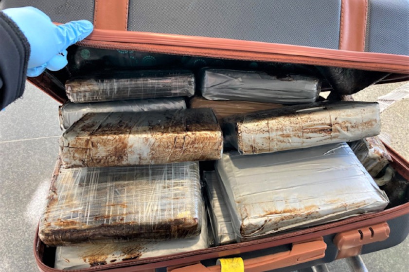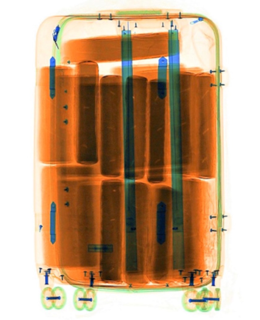 Das herrenlose Gepäckstück hatte – so wurde jetzt bekannt gegeben – bereits Ende September am Flughafen für einiges Aufsehen sorgt, als nach dem Öffnen die Vermutung aufkam, dass es mit Drogen bestückt sein könnte. "Beschäftigte der Gepäck-Ermittlung stießen auf die im Koffer befindlichen, mit Klebeband umwickelten Pakete beziehungsweise Platten und verständigten umgehend den Zoll am Flughafen", heißt es weiter. Nach dem Röntgen (Foto unten) und einem durchgeführten Test auf mutmaßliche Drogen habe sich dann herausgestellt, dass es sich bei dem Fundgut wohl um rund 22 Kilogramm Kokain handeln müsste.