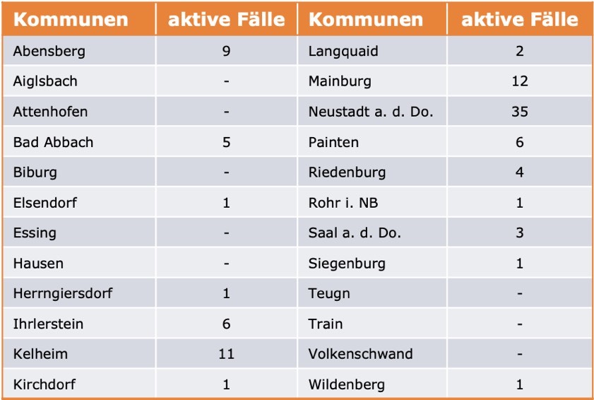(ty) Im Kreis Kelheim gibt es in Zusammenhang mit der Corona-Pandemie, wie berichtet, mittlerweile 111 Menschenleben zu beklagen. Die weitere Situation stellt sich wie folgt dar: Unter Verweis auf Daten des Gesundheitsamts teilte das Landratsamt heute mit, dass – Stand gestern, 16 Uhr – die Zahl der im Kreis Kelheim positiv auf den neuartigen Erreger getesteten Menschen bei insgesamt 6933 liegt: Das sind zehn mehr als gestern gemeldet. Insgesamt 6723 hiesige Corona-Patienten (gestern: 6713) wurden wieder aus der Quarantäne entlassen und gelten als genesen. Derzeit gebe es 99 aktive Corona-Fälle im Landkreis (gestern: 99). Zahlen aus den einzelnen Gemeinden zeigt die Tabelle unten. Seit 2. September gelten bayernweit völlig neue Corona-Regeln (Details siehe unten).