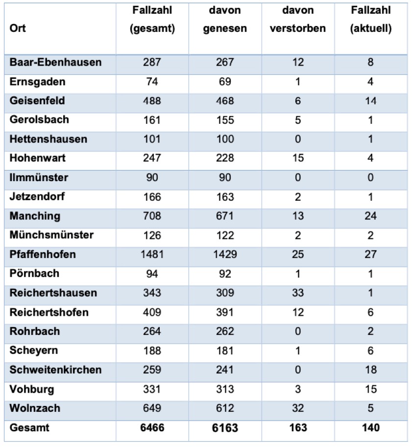 (ty) In Zusammenhang mit der Corona-Pandemie gibt es im Kreis Pfaffenhofen, wie berichtet, mittlerweile 163 Menschenleben zu beklagen. Das Landratsamt veröffentlicht eine tägliche Übersicht (Tabelle unten), in welchen Gemeinden die mit dem Virus infizierten Menschen, die gestorben sind, gelebt haben beziehungsweise wie viele bestätigte Infektionsfälle und genesene Patienten es in welcher Kommune gibt. Die Zahl der Landkreis-Bürger, die positiv auf den neuartigen Erreger getestet worden sind, hat sich seit der Meldung von gestern um 23 erhöht und beträgt somit aktuell 6466. Seit 2. September gelten bayernweit völlig neue Corona-Regeln (Details siehe unten).